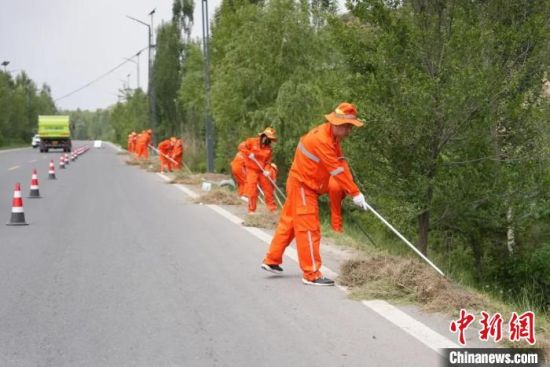 资料图为青海公路部门组织人员进行环青赛涉赛路段路肩蒿草修剪。 青海省公路局供图